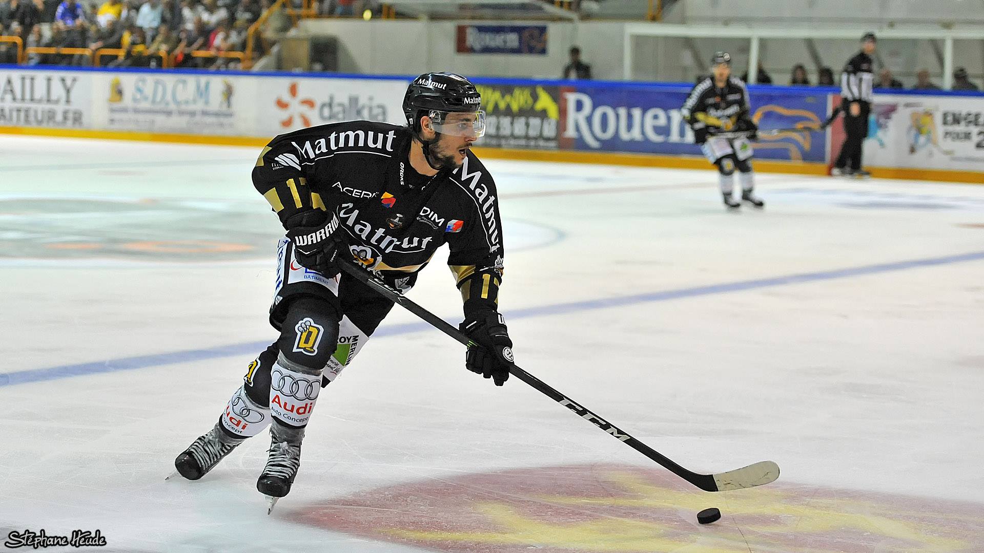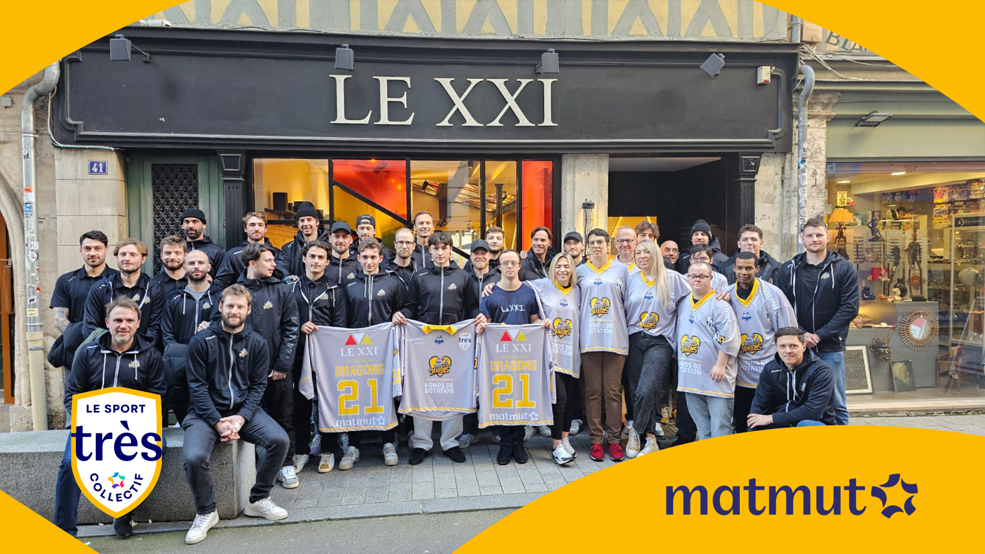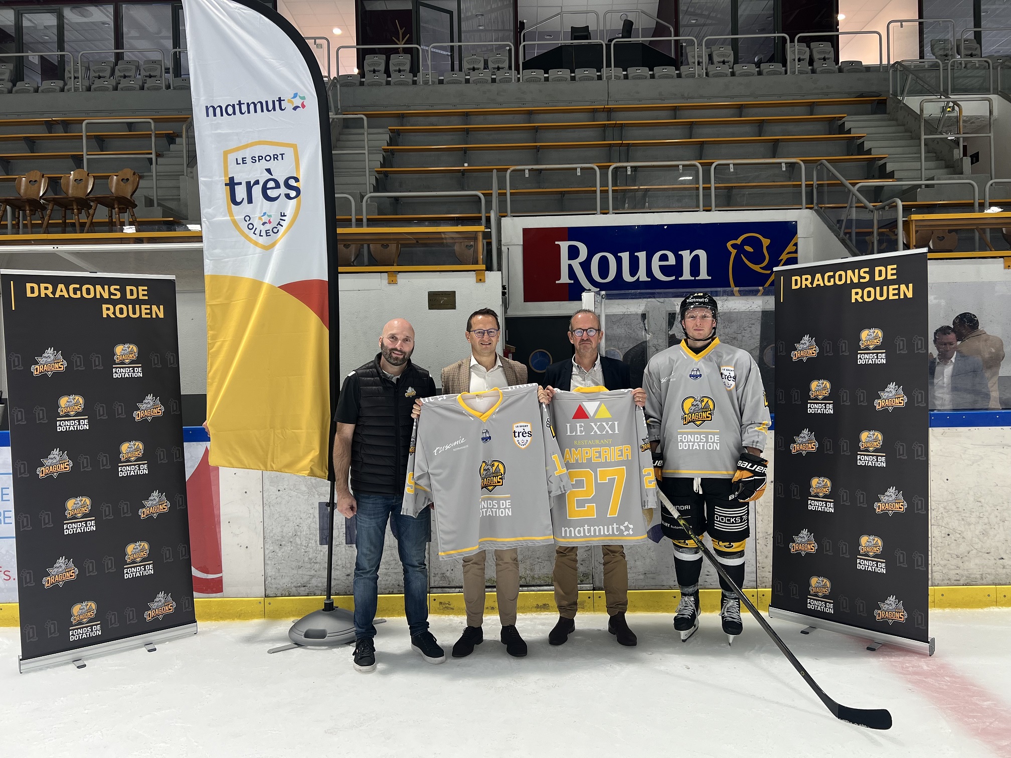 De gauche à droite : Marc-André THINEL, président du Fonds de Dotation des Dragons, Emmanuel PETIT, directeur RSE du Groupe Matmut, Eric VANDEWYNCKELE, administrateur Trisomie 21 Normandie et Anthony RECH, attaquant RHE76 © Matmut
