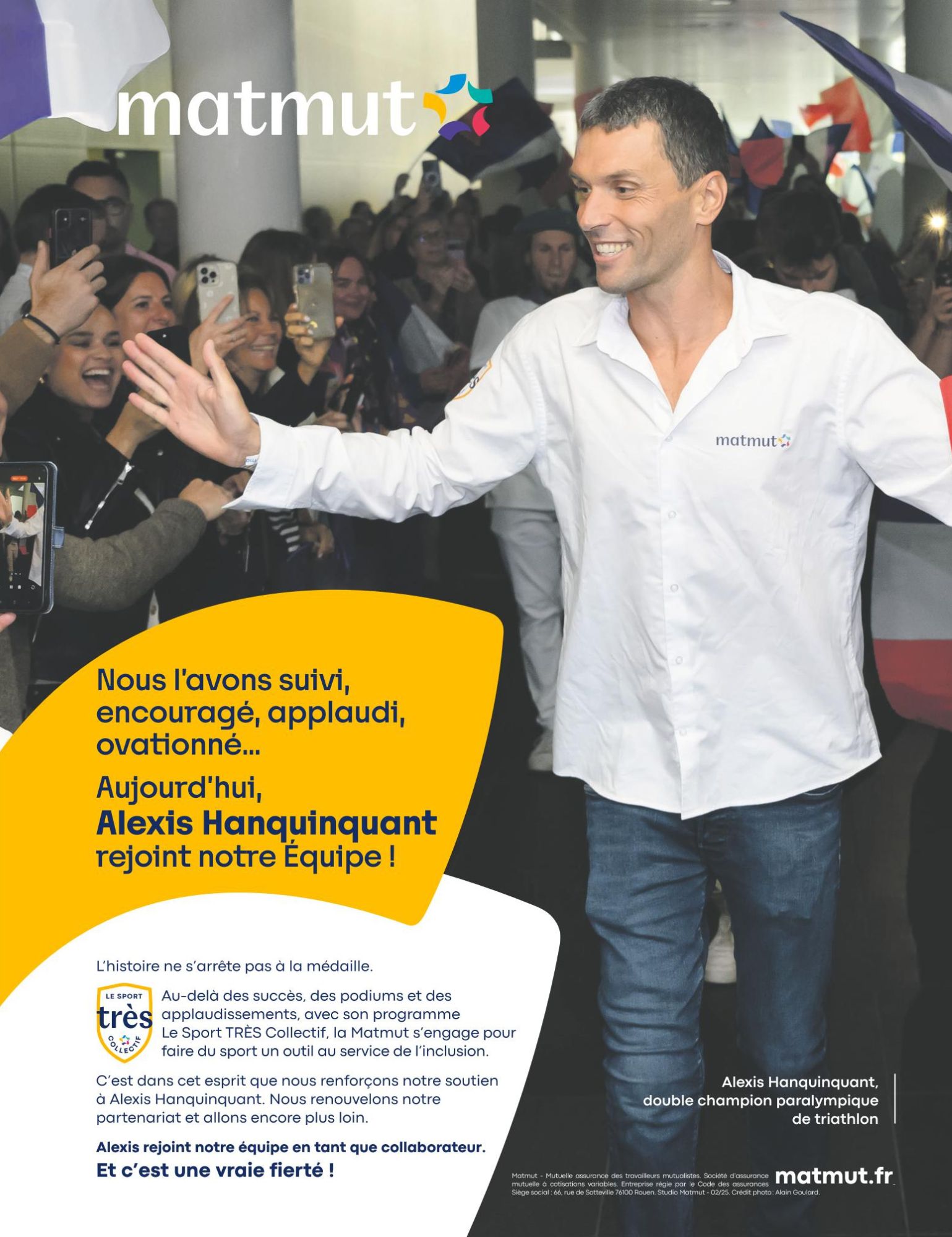 Depuis 2022, la Matmut et le paratriathlète multimédaillé Alexis Hanquinquant sont engagés dans une collaboration forte dans le cadre du programme d’engagement « Le Sport Très Collectif » de la Matmut.