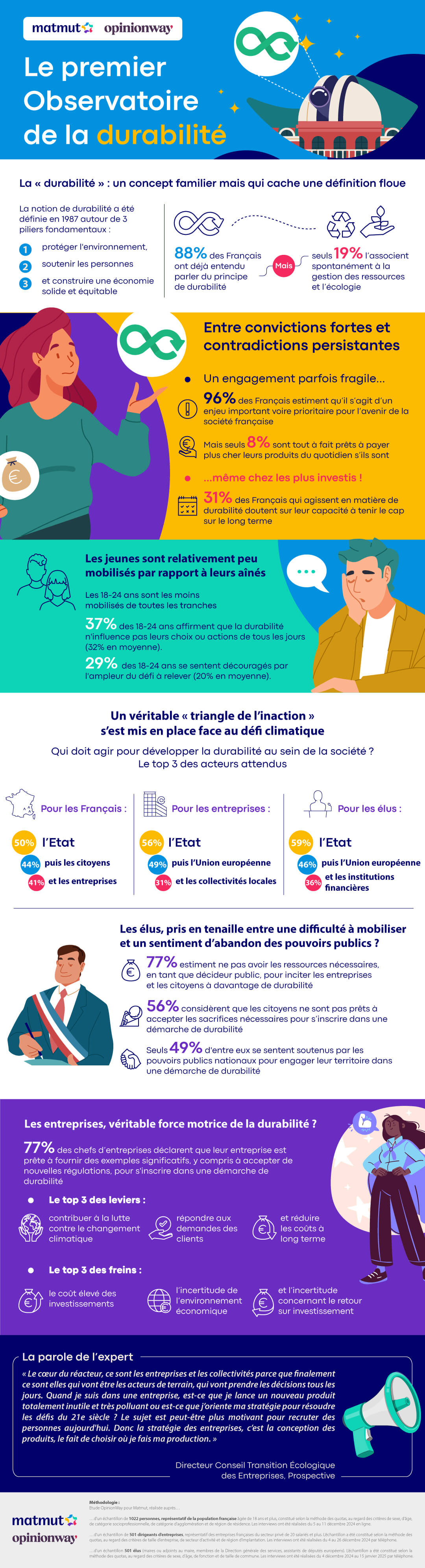 Commentant cet observatoire, Stéphanie Boutin, membre du comité exécutif du Groupe Matmut en charge des Directions RSE, Communication et Philanthropie a déclaré : « La durabilité est un enjeu collectif qui appelle à l'engagement de tous les acteurs de la société. Avec le lancement de ce premier observatoire, nous visons à éclairer les perceptions et les attentes de l’ensemble des acteurs, tout en identifiant les freins et les leviers nécessaires pour transformer cette prise de conscience en actions concrètes. En combinant des données quantitatives et qualitatives, il se positionne comme un outil essentiel pour naviguer sans angélisme dans les défis environnementaux, économiques et sociaux qui nous attendent.»