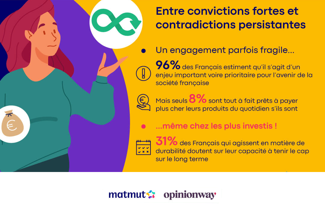 - 96% d’entre eux estiment que la durabilité représente un enjeu « important voire prioritaire pour l’avenir de la société française » mais seuls 8% sont tout à fait prêts à payer plus cher leurs produits du quotidien s’ils sont durables.