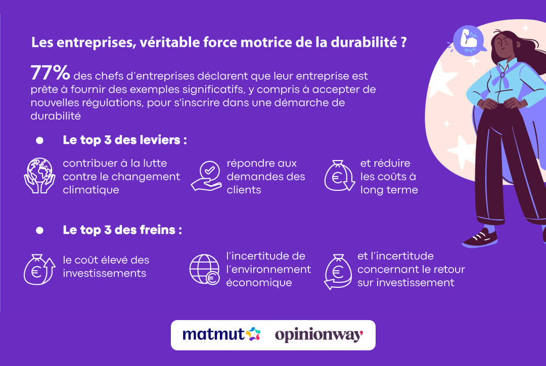 • 77% des chefs d’entreprises déclarent que leur entreprise est prête à fournir des exemples significatifs, y compris à accepter de nouvelles régulations, pour s'inscrire dans une démarche de durabilité.